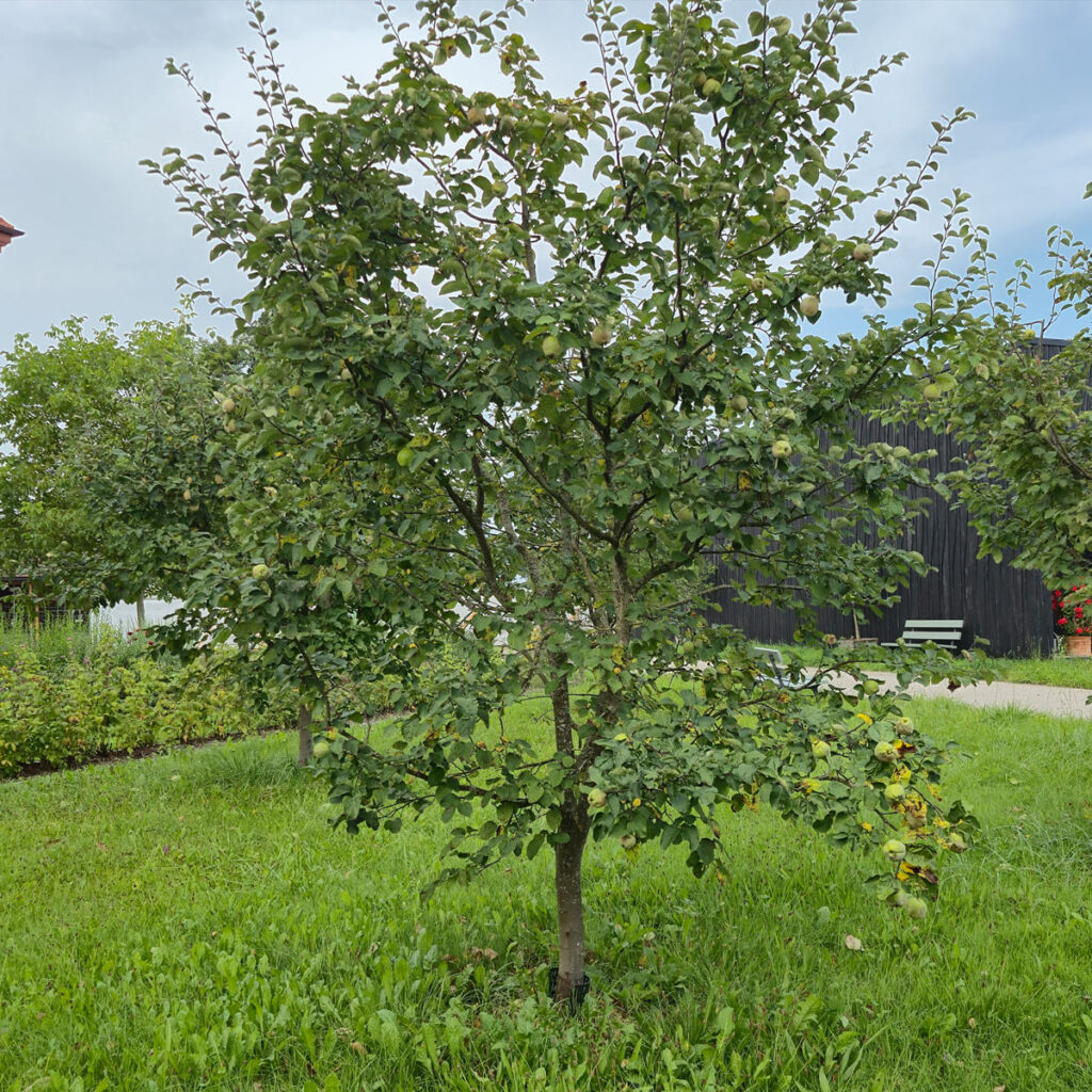 Im Mai öffnen sich die üppigen, weiß bis rosé getönten Blüten – größer und auffälliger als bei Apfel oder Birne. Sie sind nur für wenige Wochen da, doch ihr Anblick bleibt unvergesslich. Danach wachsen langsam die Früchte heran, die sich bis Oktober in ein leuchtendes Gelb verwandeln. Mit ihrem feinen Flaum und dem intensiven Duft wirken sie fast wie Märchenfrüchte, die mehr versprechen als nur Genuss.