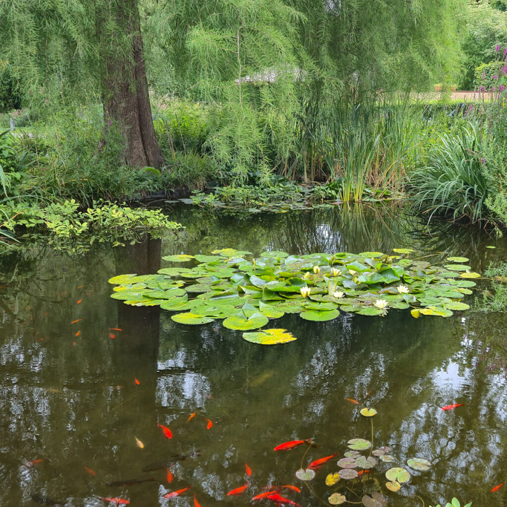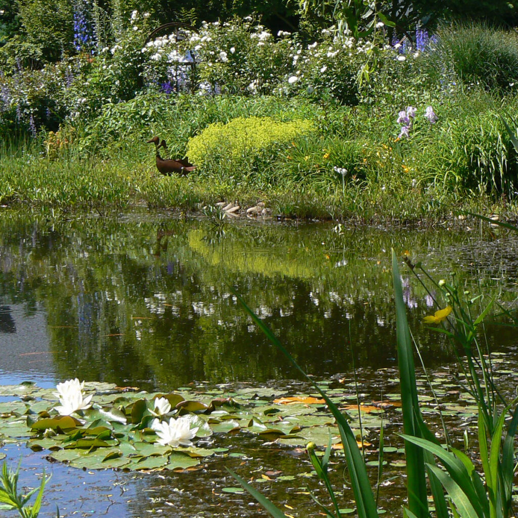 Größere Teiche beeindrucken durch weite Wasserflächen und blühende Schwimmpflanzen wie Seerosen, Laichkraut oder Froschbiss. Breite, flache Ufer bieten ideale Bedingungen für Tiere und erleichtern die Pflege.