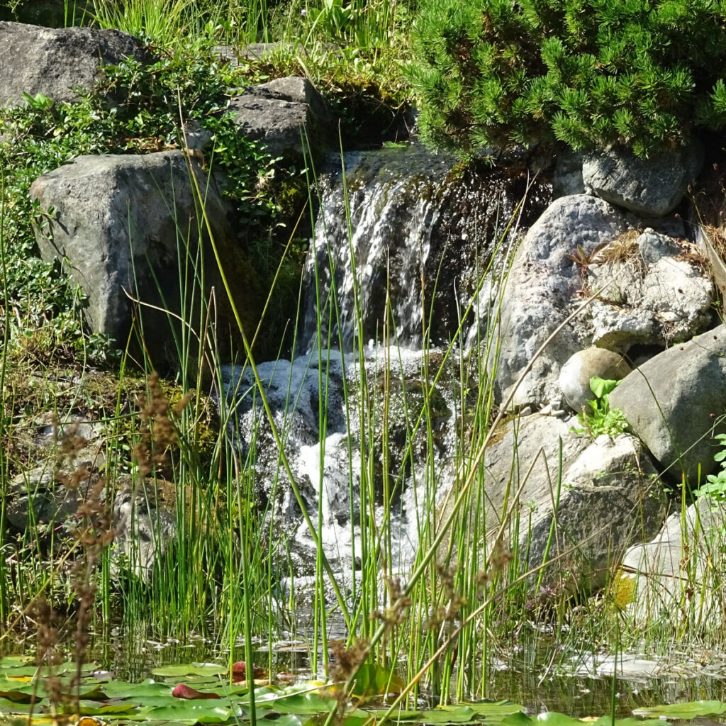 Wasser in Bewegung verleiht dem Garten eine besondere Magie. Ein Bachlauf, der sich durch das Gelände schlängelt, ein Wasserfall, der über Felsbrocken stürzt, oder mehrere durch Kaskaden verbundene Wasserflächen schaffen eindrucksvolle Bilder und eine beruhigende Klangkulisse. Das leise Murmeln oder Plätschern überdeckt störende Geräusche und sorgt für Entspannung.