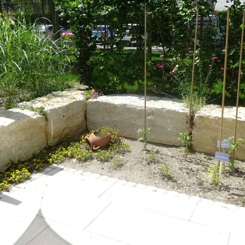Durch die Absenkung und die umgebenden Mauern ist der Bereich deutlich windgeschützter. Das reduziert die Verdunstung – ein entscheidender Vorteil in heißen, trockenen Sommern.