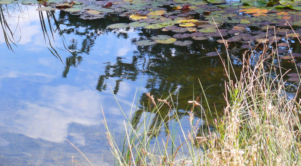 Bevor der Teich zufriert, sollte er entschlammt und von Laub befreit werden. Schneiden Sie abgestorbene Pflanzenreste am Ufer zurück, lassen Sie aber einige Halme über der Wasseroberfläche stehen – sie ermöglichen den Gasaustausch unter der Eisdecke.