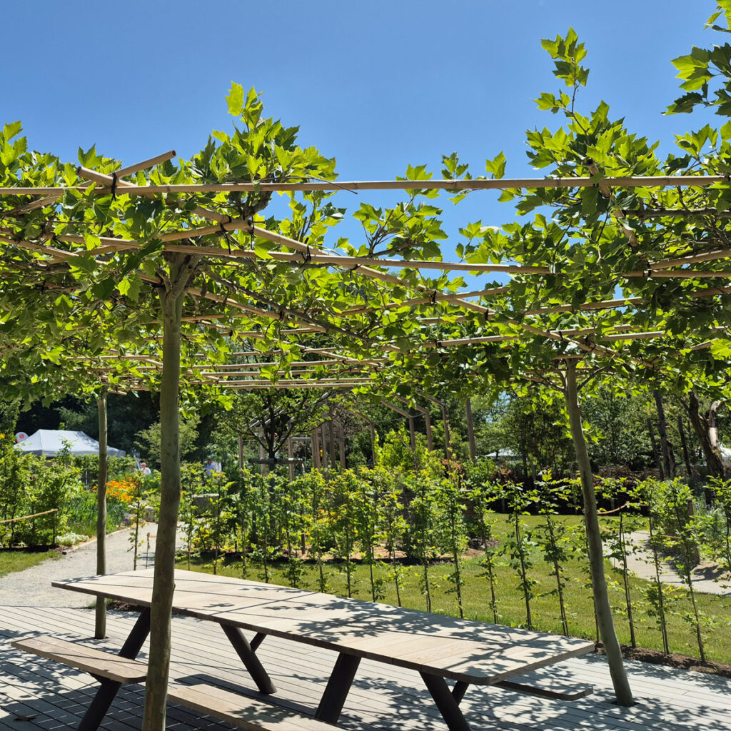 Auch eine Pergola im Garten, an der wilder oder echter Wein, Glyzinen, Kletterrosen, Clematis, Geißblatt oder die Großblättrige Pfeifenwinde ranken, ist ein wunderbarer Schutz im Sommer. Wenn der Wind leise durch die Blätter rauscht, bleibt es hier an schwülen Tagen herrlich frisch. Eine Gruppe von geschnittenen Schirmbäumen wie Platanen, Amber- oder Maulbeerbäumen bietet ebenfalls angenehmen Schutz.