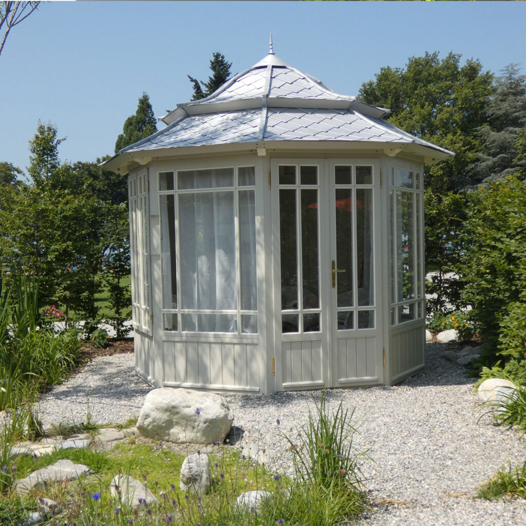 Wenn Sie kühle Herbsttage oder den Feierabend draußen genießen wollen, sind solche geschützten Räume ideal. Ein ganz besonderer Zauber, ein Hauch von Romantik, Nostalgie und Geborgenheit geht von ihnen aus. Sie bieten uns allein oder in Gesellschaft das wunderbare Gefühl mitten im Garten in lichtdurchfluteten Räumen zu sein, ohne auf ein schützendes Dach verzichten zu müssen.