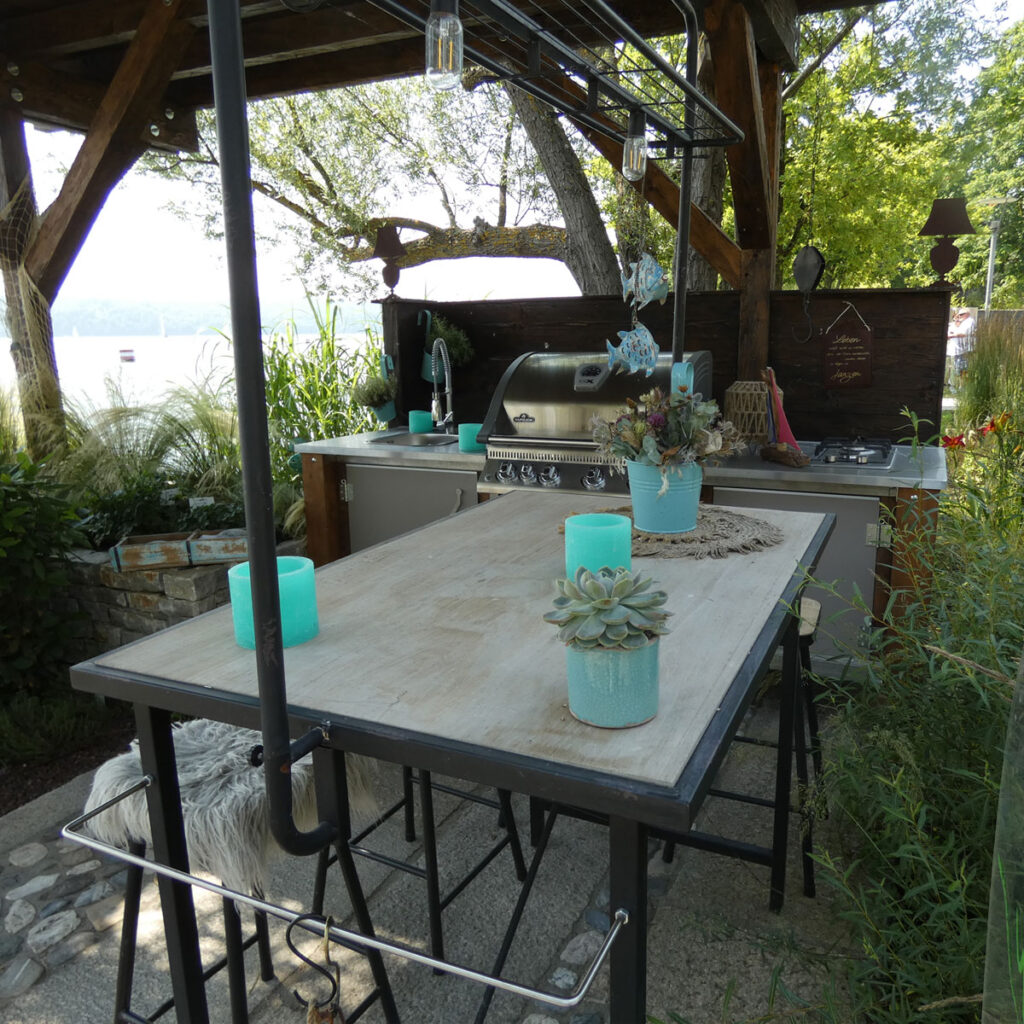 Ein überdachter Sitzplatz ist ideal, wenn man im Garten kochen möchte. Hier kann man einen festen Grill oder eine Outdoor Küche installieren. Es geht dabei locker und entspannt zu; denn wer draußen kocht, nimmt die Dinge viel gelassener und reagiert flexibel. Wenn abends die letzten Sonnenstrahlen verschwinden, beginnt hier die schönste Zeit fürs Kochen und Genießen im Garten.